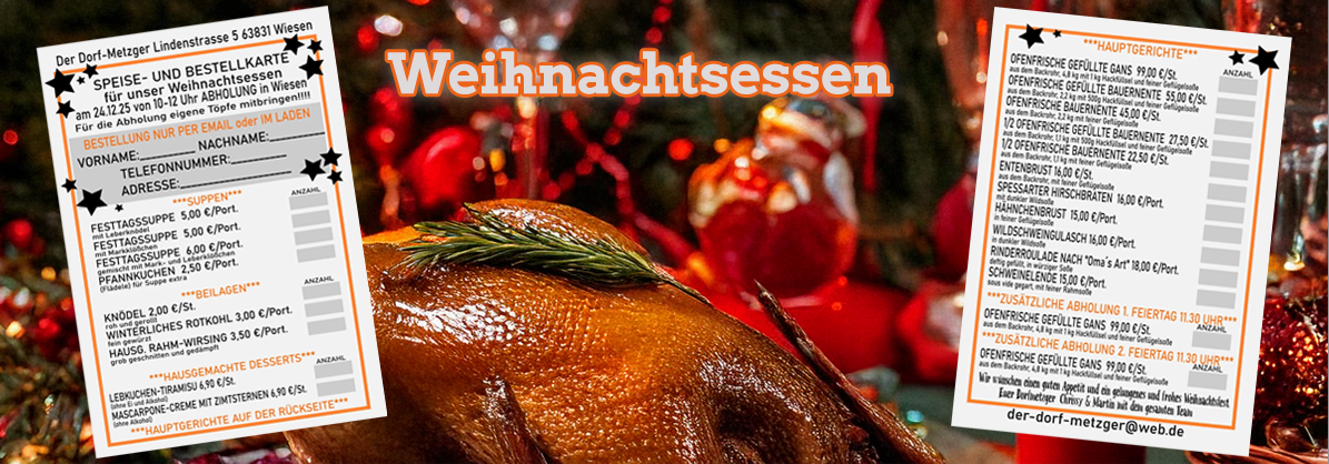 Ab sofort sind Bestellungen für euer Weihnachtsessen am 24.12.2025 und Gänsebestellungen für den 1. und 2. Weihnachtsfeiertag möglich!